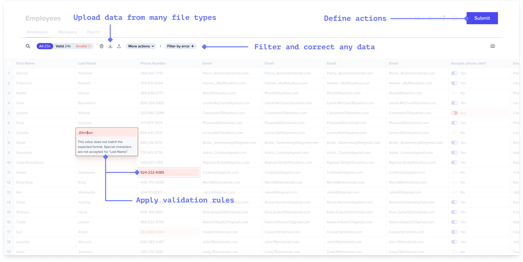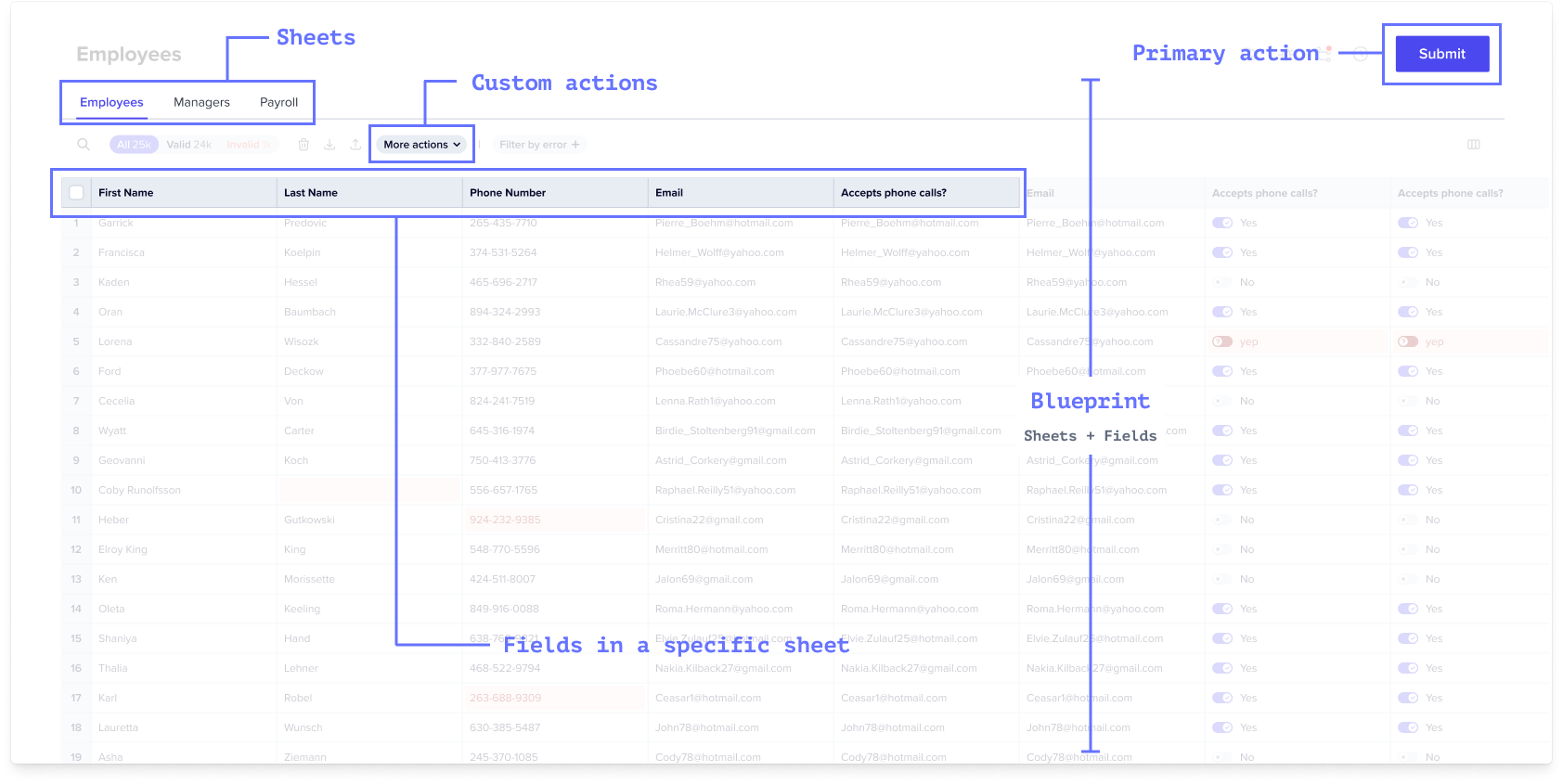 Workbooks are analogous to a database, and like a database, they are configured with a type-strict schema. A Workbook replaces the spreadsheet template you may share with your users today when requesting data during the data collection phase of customer onboarding or other file-based data exchange processes. Unlike a spreadsheet, it’s designed to allow your team and users to validate, correct, and import data with real-time feedback.